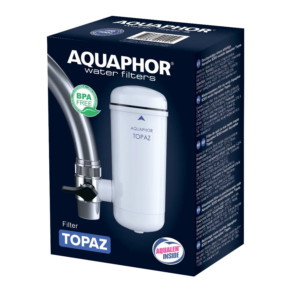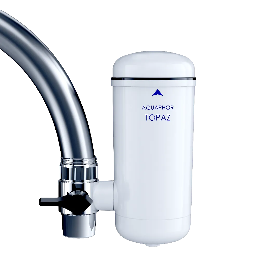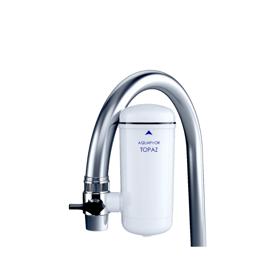 Aquaphor Topaz is a compact water filter that can be fastened to any faucet with a mode switch (filtered/non-filtered).